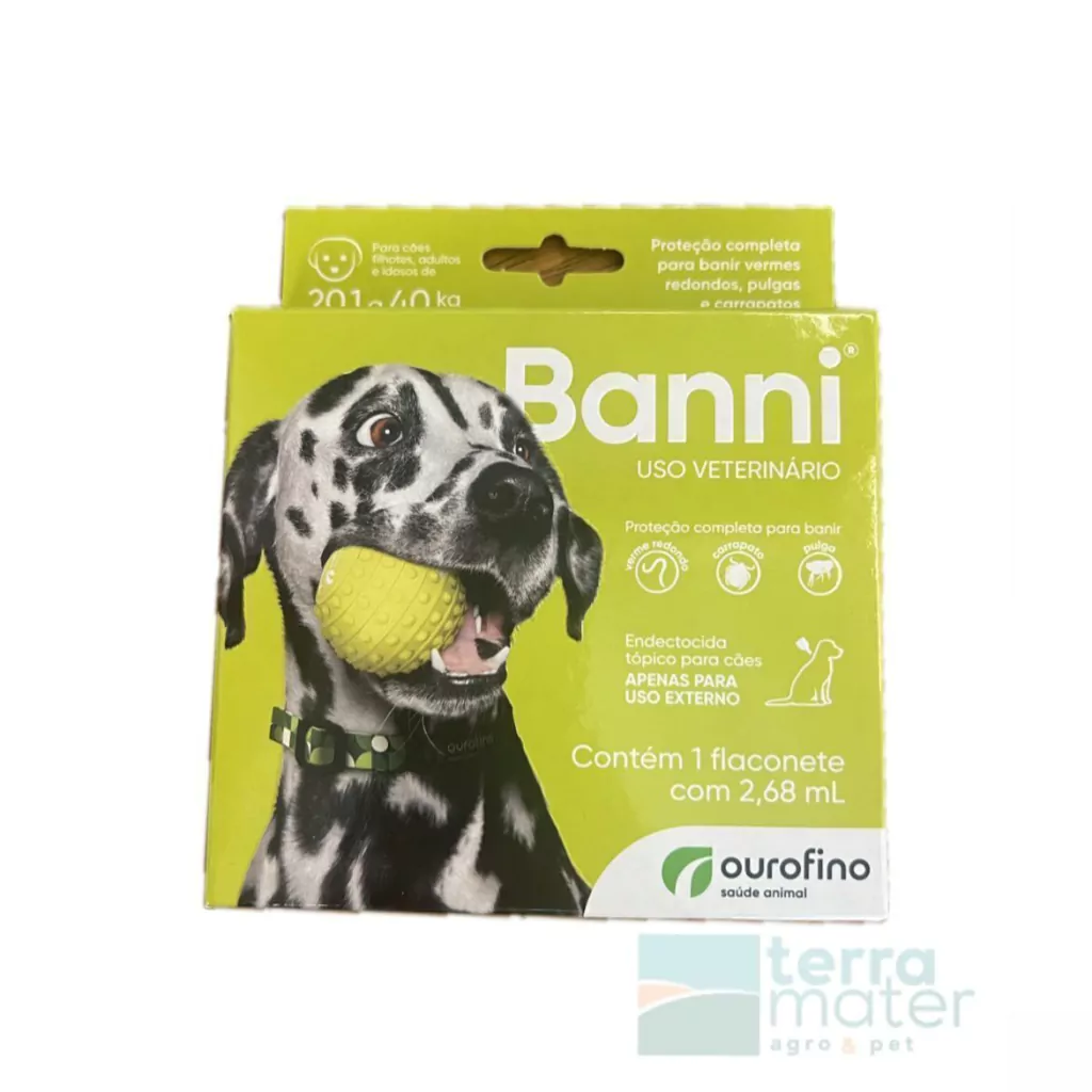 Indicações: Banni é um endectocida tópico para cães composto pela associação entre fipronil e moxidectina para tratamento de infestações por pulgas, carrapatos e por helmintos gastrointestinais.