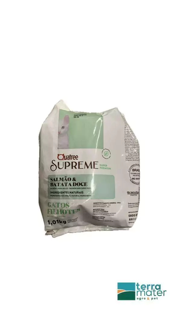 A Ração Seca Quatree Supreme Salmão e Arroz Gatos Filhotes é um alimento Super Premium formulado especificamente para atender as necessidades nutricionais de gatos filhotes de todas as raças. Elaborado com fontes nobres de proteínas e ingredientes selecionados, garante o crescimento forte e saudável do pequeno felino. É rico em DHA, que auxilia o desenvolvimento da visão e do sistema nervoso central. Possui antioxidantes naturais, que dão suporte às defesas do organismo e proporcionam mais saúde e vitalidade ao filhote.